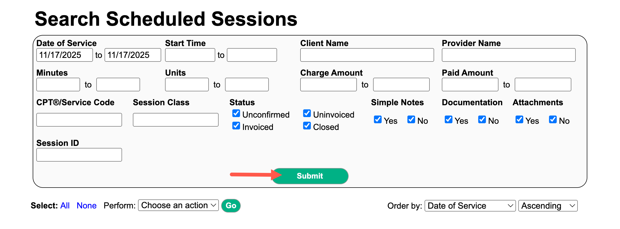 - Locate the session using filters, if needed. Click Submit.