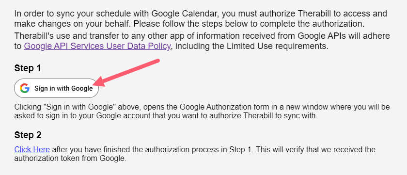 In order to sync your schedule with Google Calendar, you must authorize Therabill to access and make changes on your behalf. Please follow the steps below to complete the authorization.