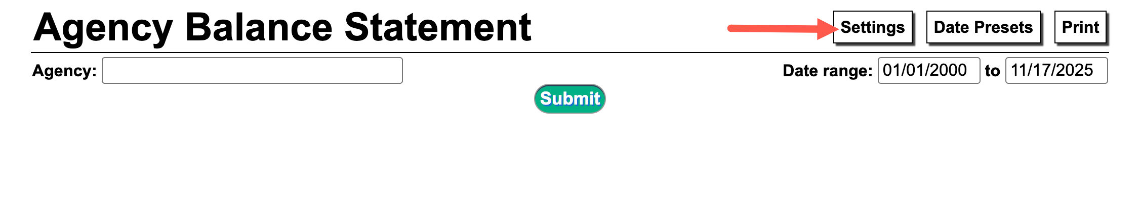 First, navigate to Billing > Bill Agency > Balance Statement and click the Settings button. A new window will appear. Let's break down each section of this window.